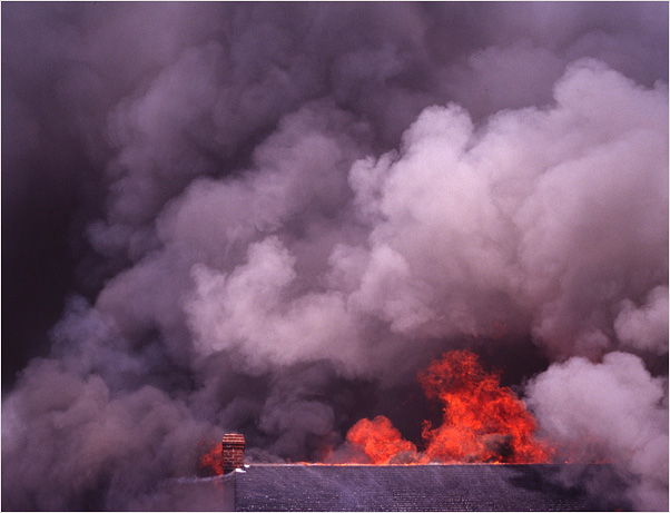 Building on fire, Hillsborough. A good part of the "smoke" is water steam, as firemen were on site
